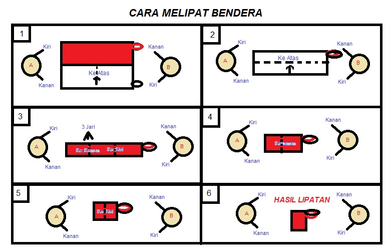 1. Di bagian kail / bagian yang terdapat tali, pegang bagian atas bendera dengan tangan kanan dan bawah bendera dengan tangan kiri, sedangkan bagian pengibar pegang atas bendea dengan tangan kiri, dan bagian bawah bendera dengan tangan kanan.